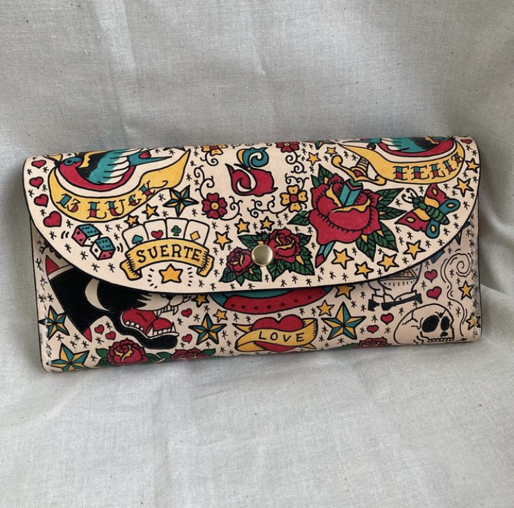Most of the motifs CBRO.m hand-paints are rooted in this tradition. Bold lines, vivid color, meaning behind every image. There’s no better style to put on leather.