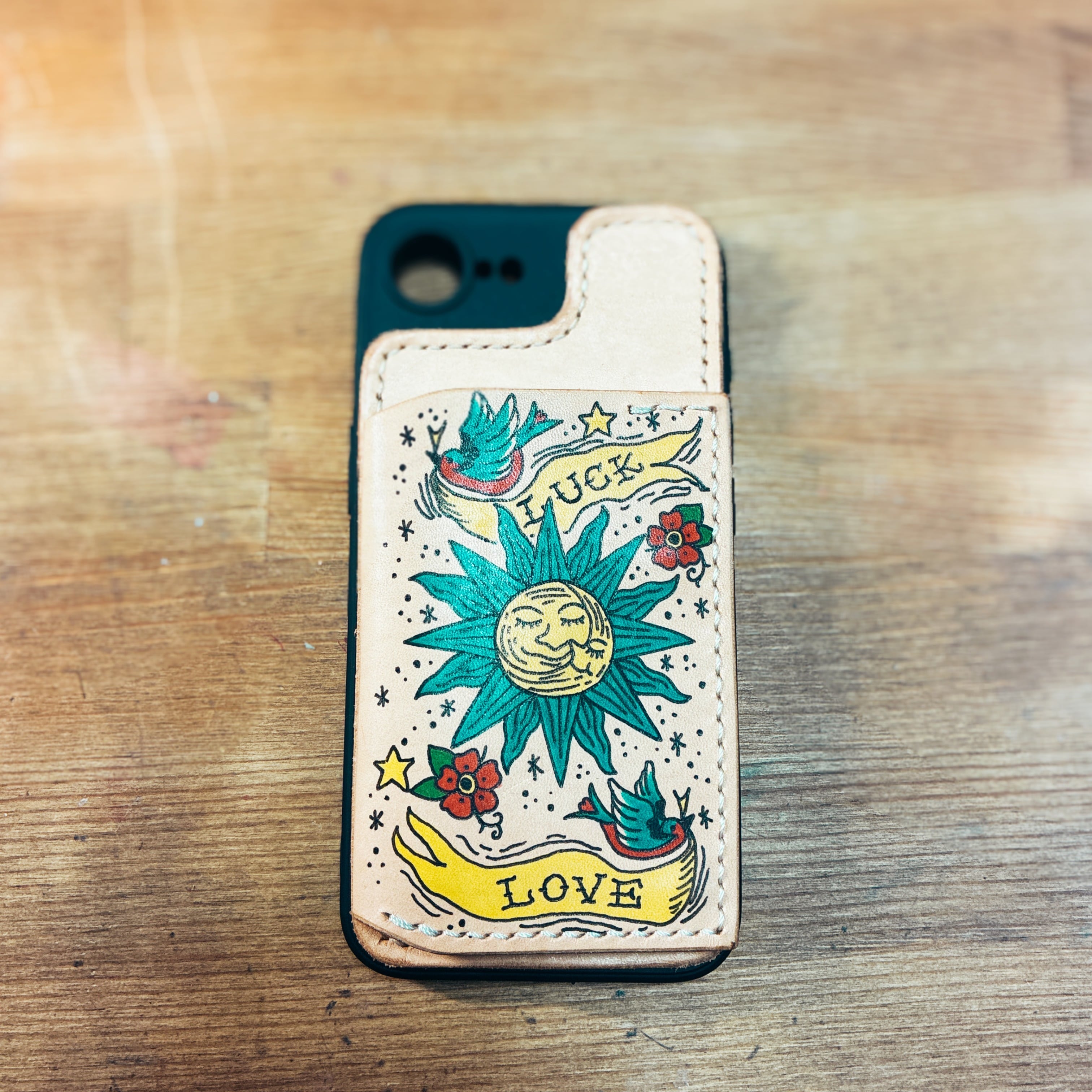 iPhone16e用 レザーケース|タトゥー風手描きイラスト入り カード収納付き本革ケース(最大6枚)