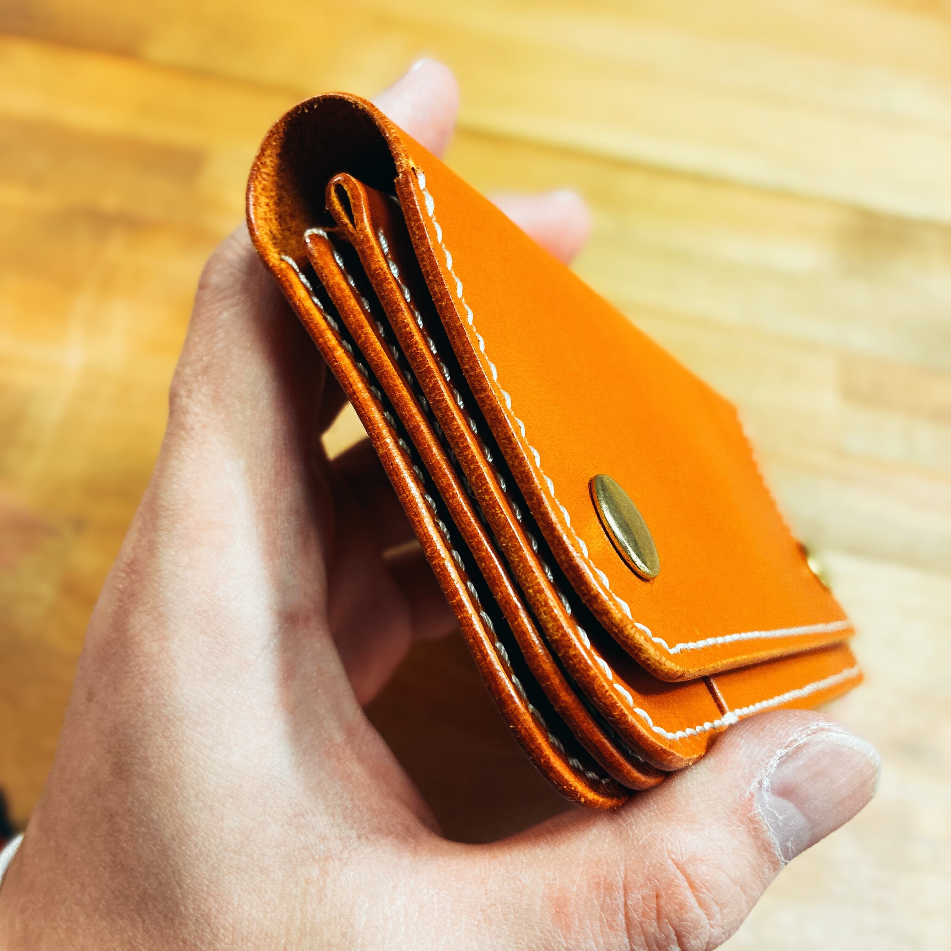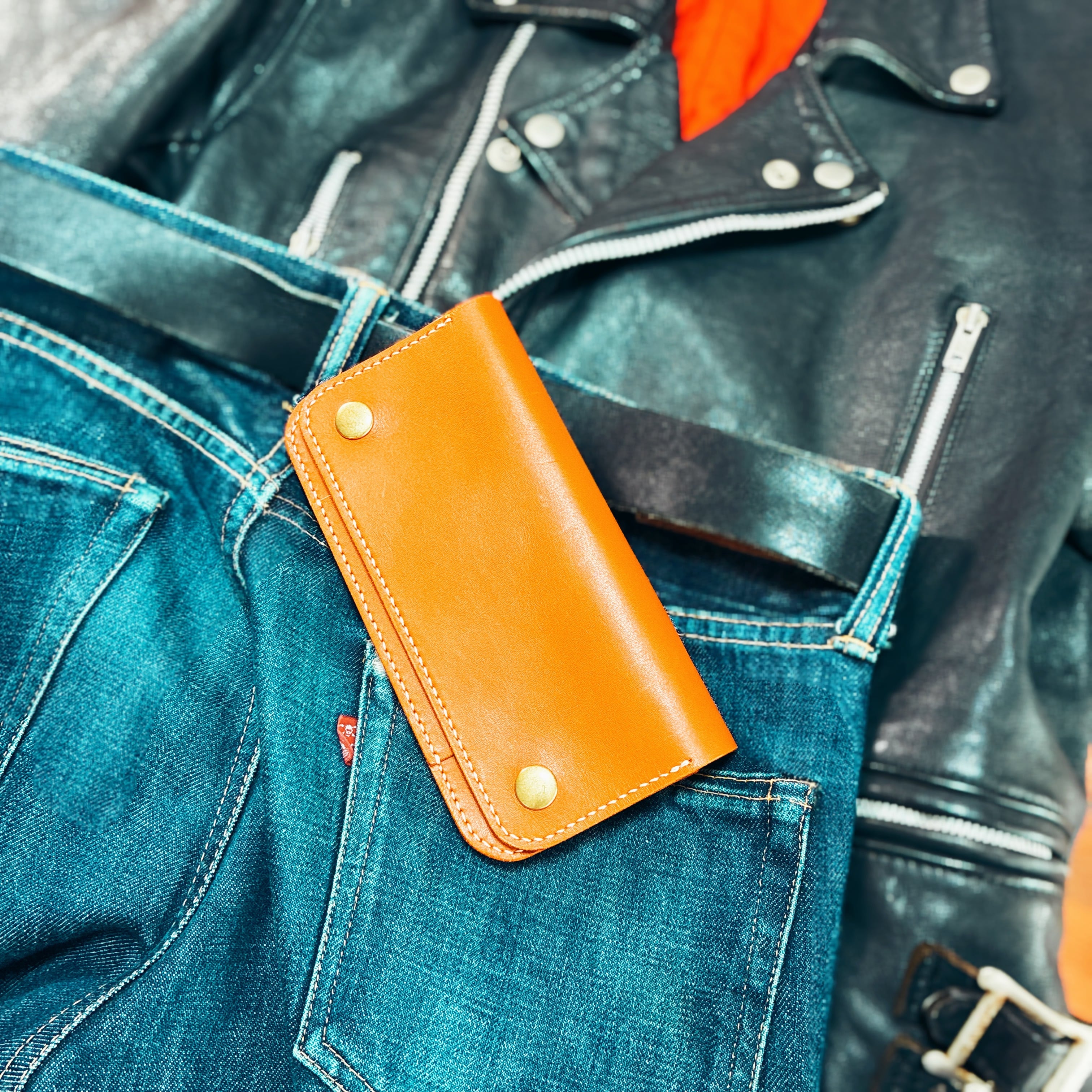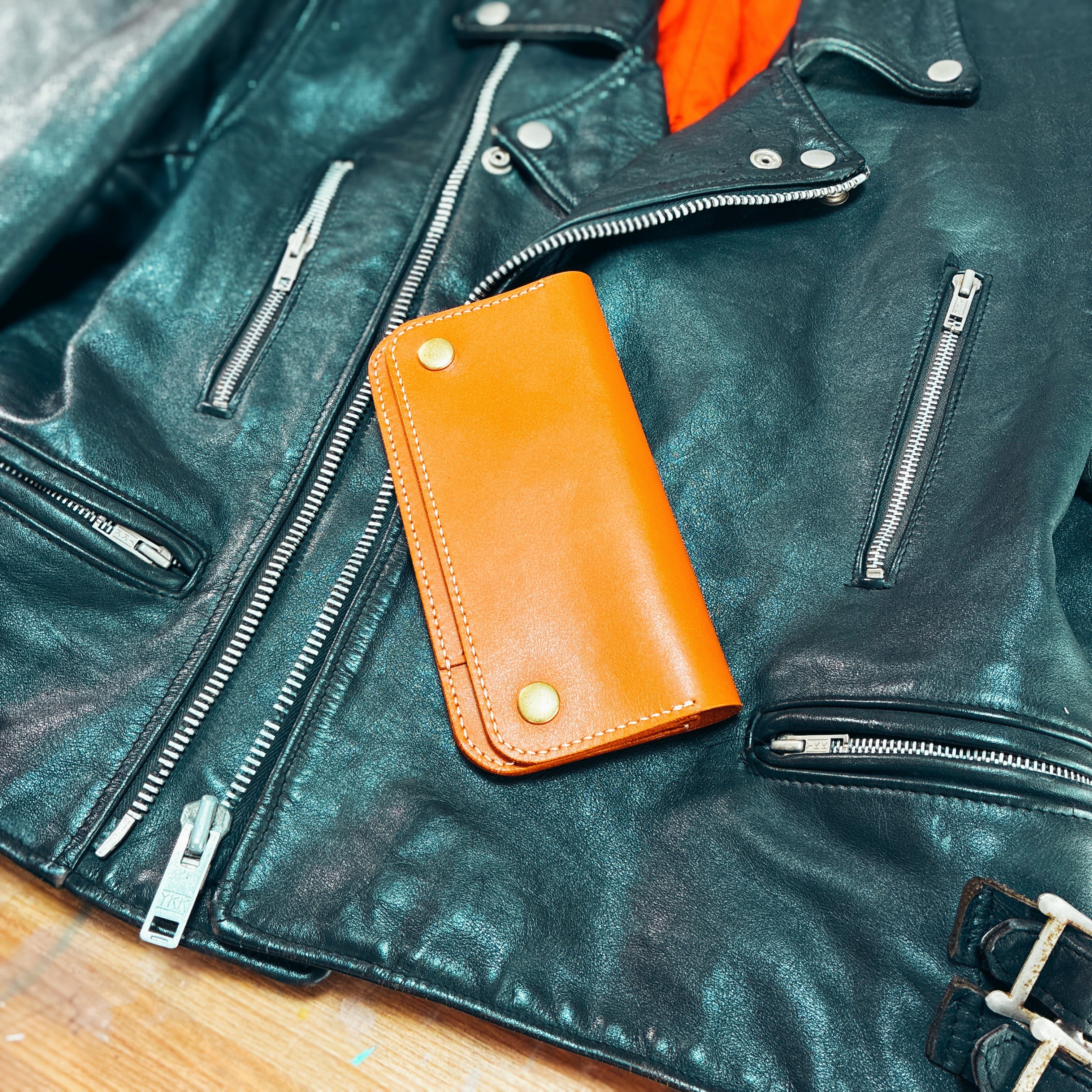 上質なピット鞣しレザーを使用した、【オレンジキャメル】トラッカーウォレットです。このウォレットは、洗練されたデザインと豊かな色合いが特徴で、あなたのスタイルに彩りを加えます。ピット鞣しならではの深みのあるオレンジキャメルの色味は、使うほどに味わいが増し、特別な一品に育っていきます。