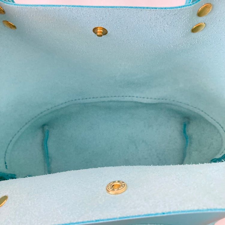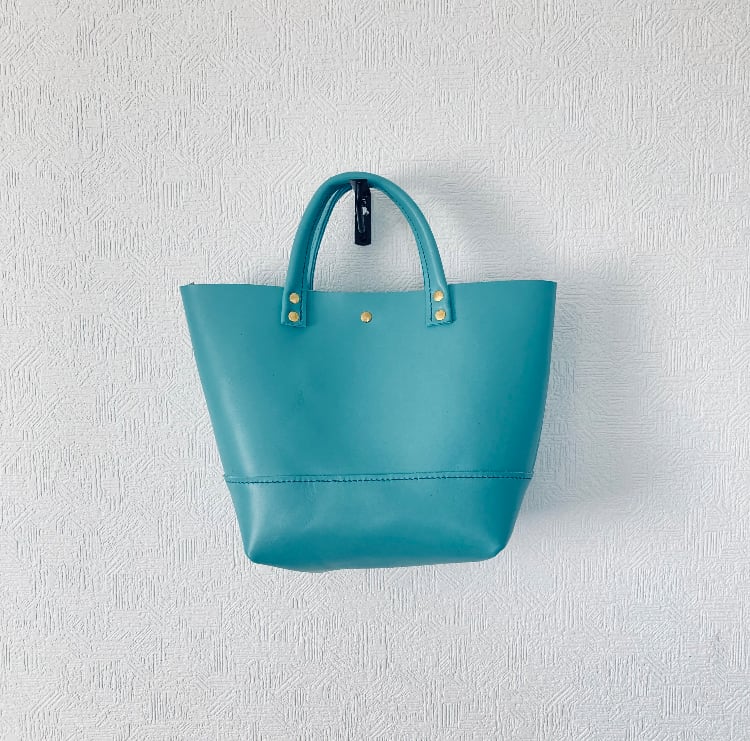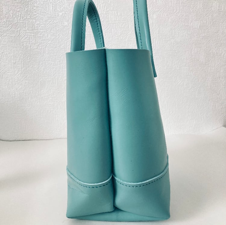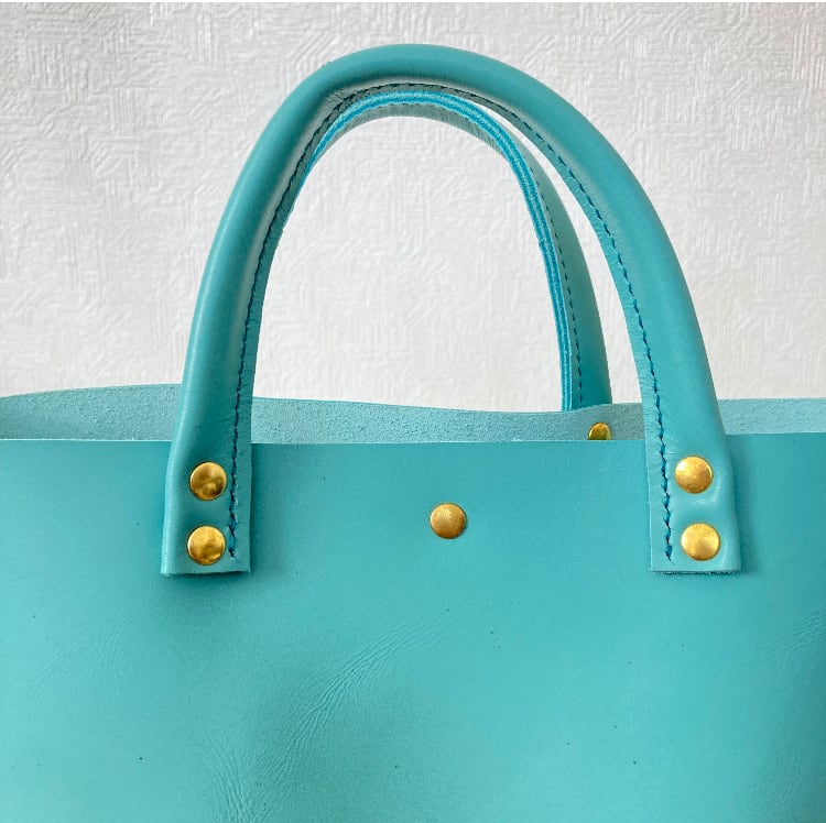 珍しいスカイブルーカラーの牛革をふんだんに使ったミニトークバッグです。