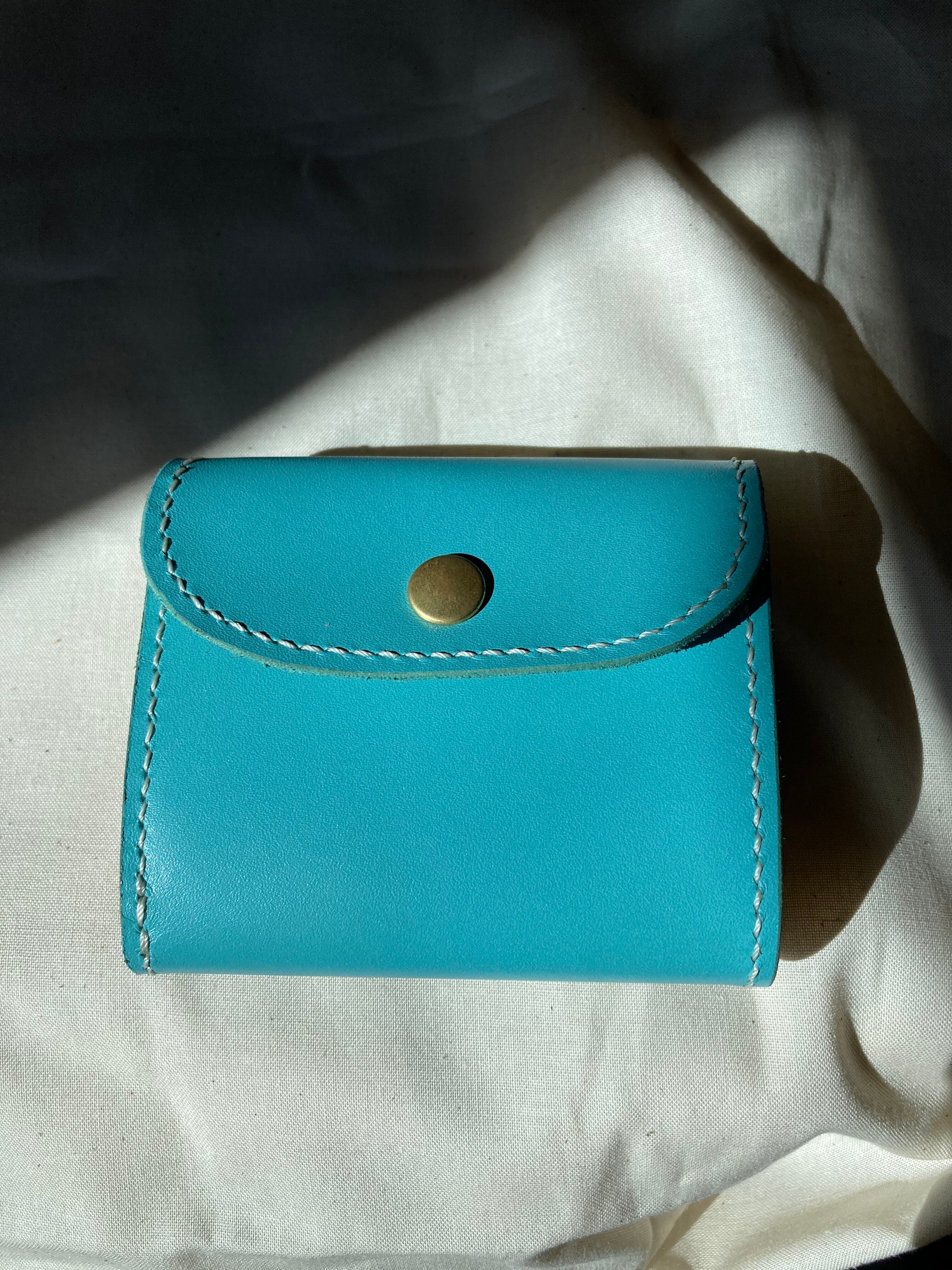 ・鮮やかなスカイブルーの牛革を使用した折り財布です。