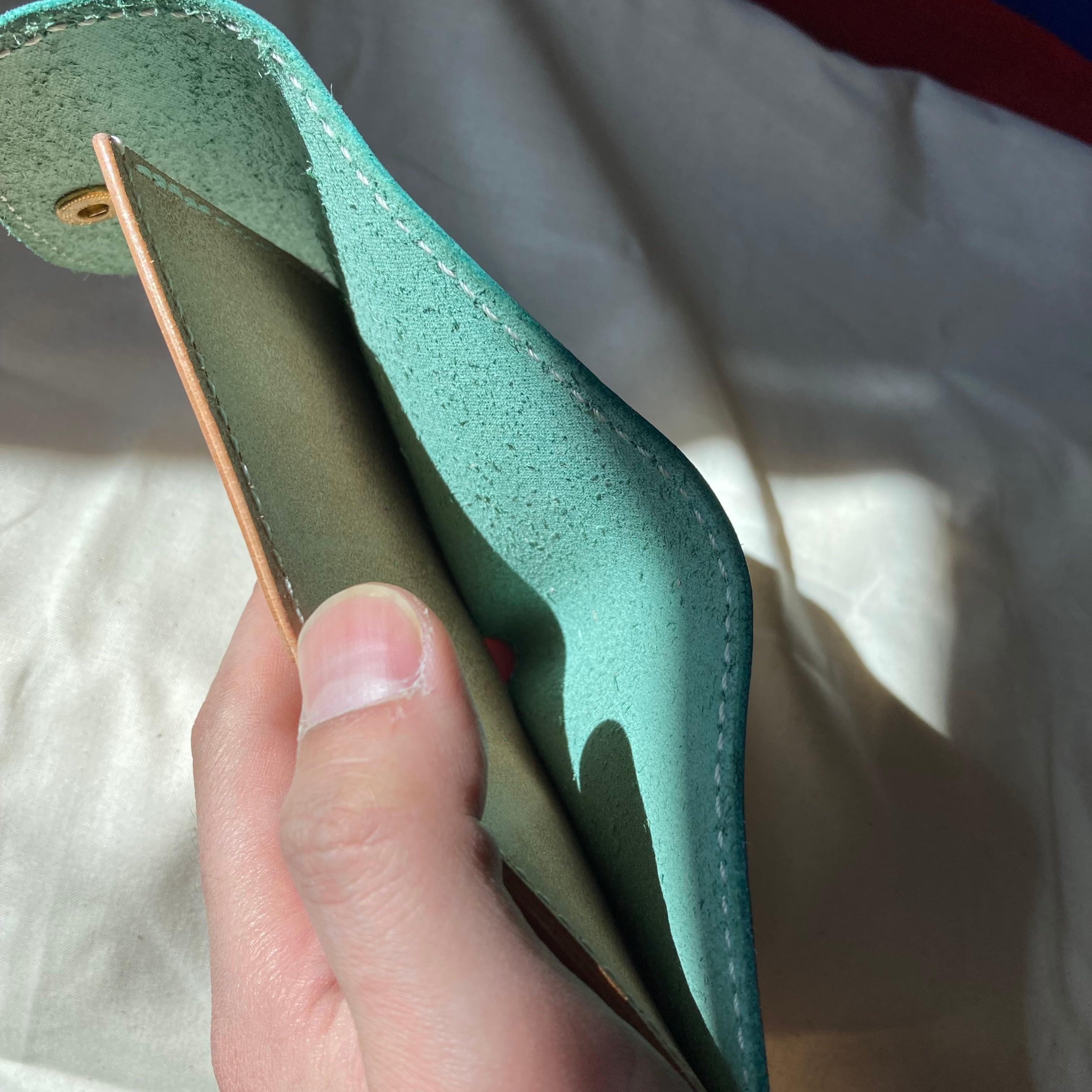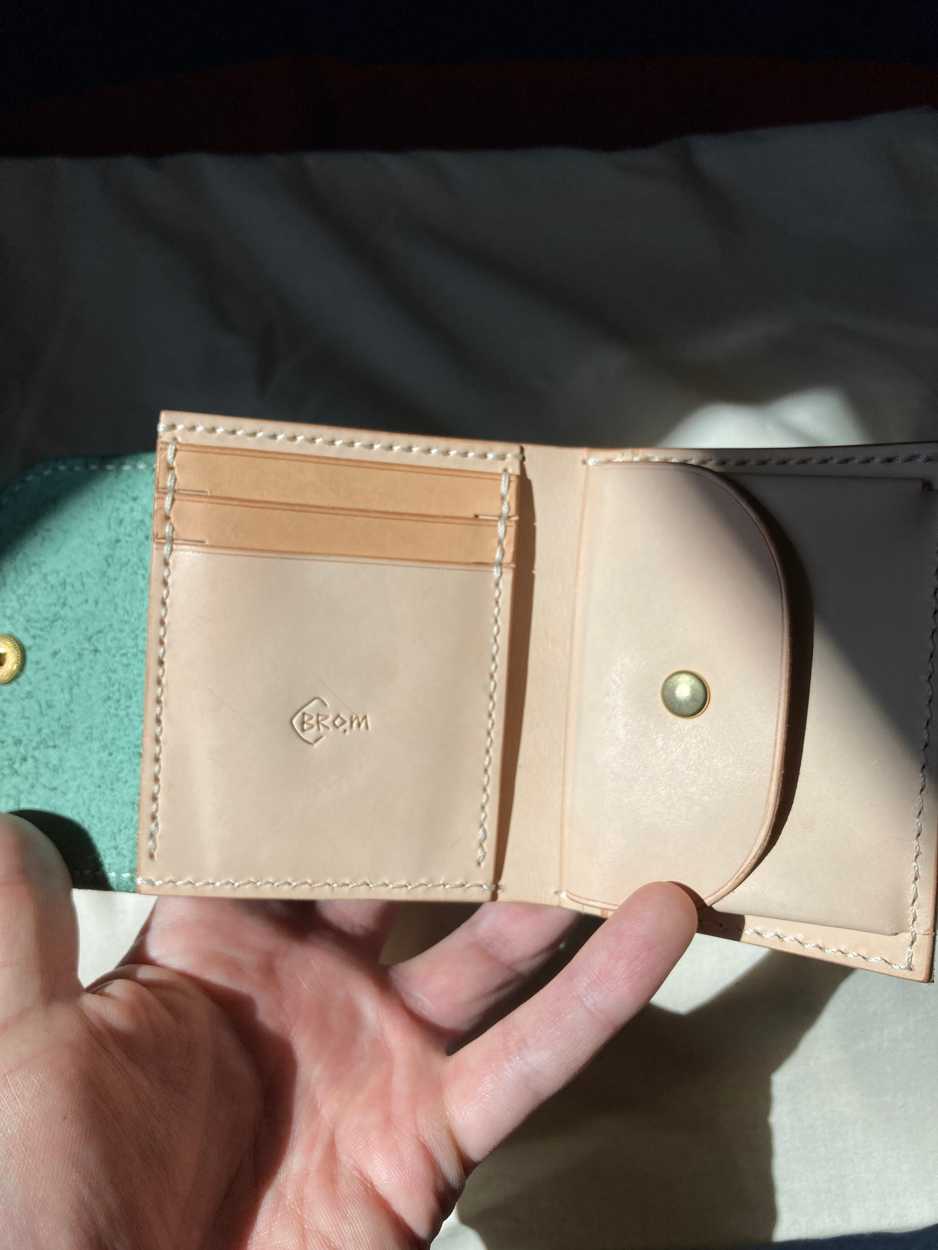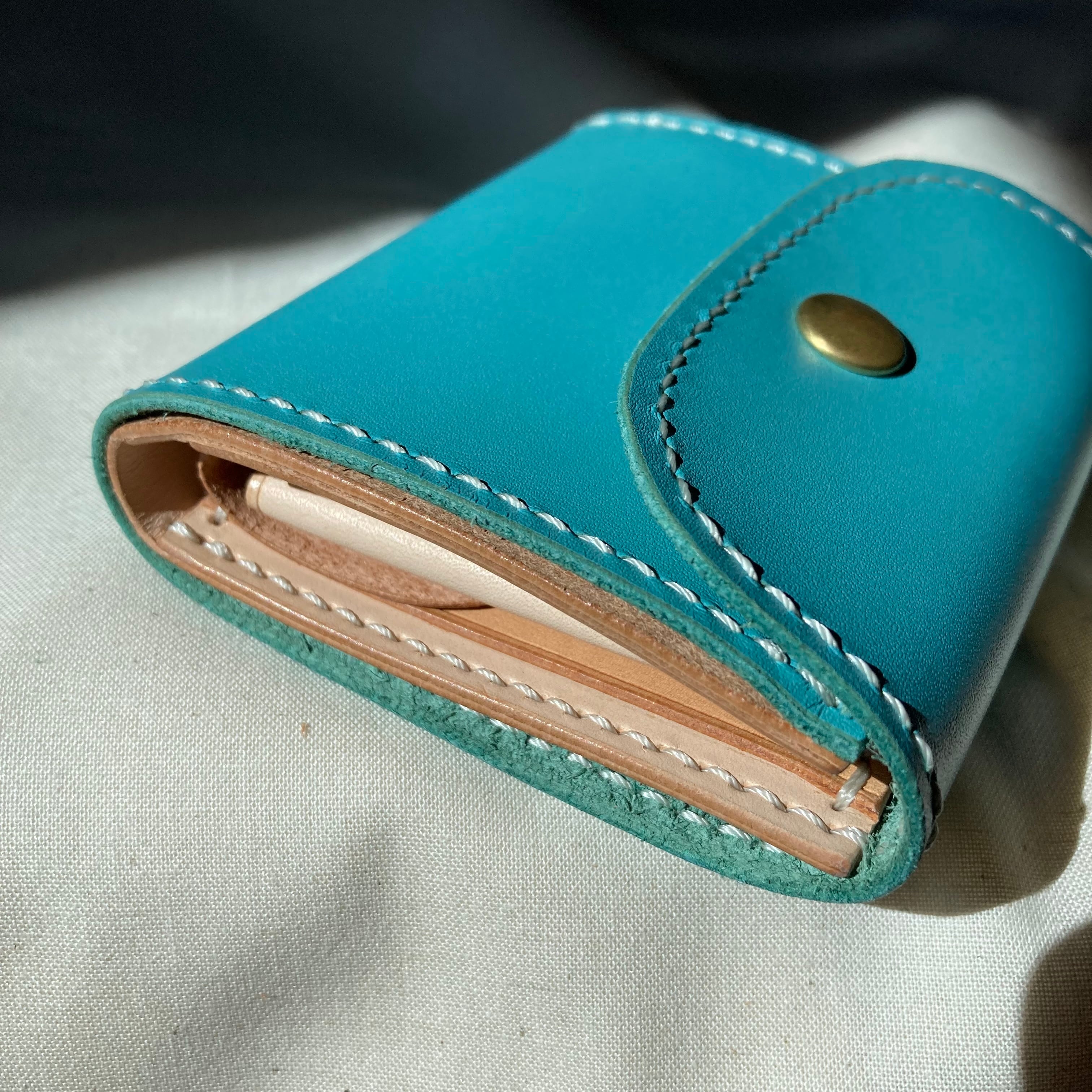 【スカイブルー】発色鮮やかなスカイブルーの牛革とヌメ革を使用したコンパクトな折り財布